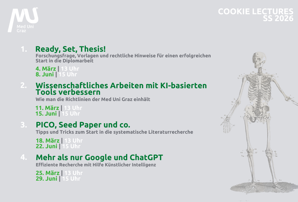 Das Team der Universitätsbibliothek der Med Uni Graz freut sich, Sie auf diesem spannenden Weg begleiten zu können! Damit Sie gut starten können, finden Sie hier eine kurze Einführung in unsere Angebote und alle wichtigen Ressourcen, die Sie für Ihr Studium benötigen.